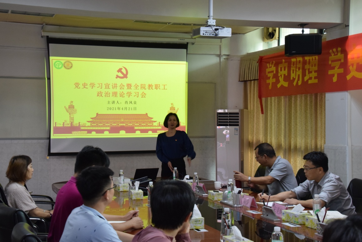 为深入学习贯彻习近平总书记在党史学习教育动员大会上的重要讲话精神,扎实推进党史学习教育,公司党委党史学习教育领导小组印发的《关于组织开展党史专题宣讲工作的通知》(莞工学组发〔2021〕1号),4月21日,sunbet申搏直属党支部在公司302会议室召开了党史学习宣讲会暨教职工政治理论学习会。会议由直属党支部书记宋美娴主持,公司马克思主义公司肖凤良教授作专题宣讲,公司教职工参加了会议。