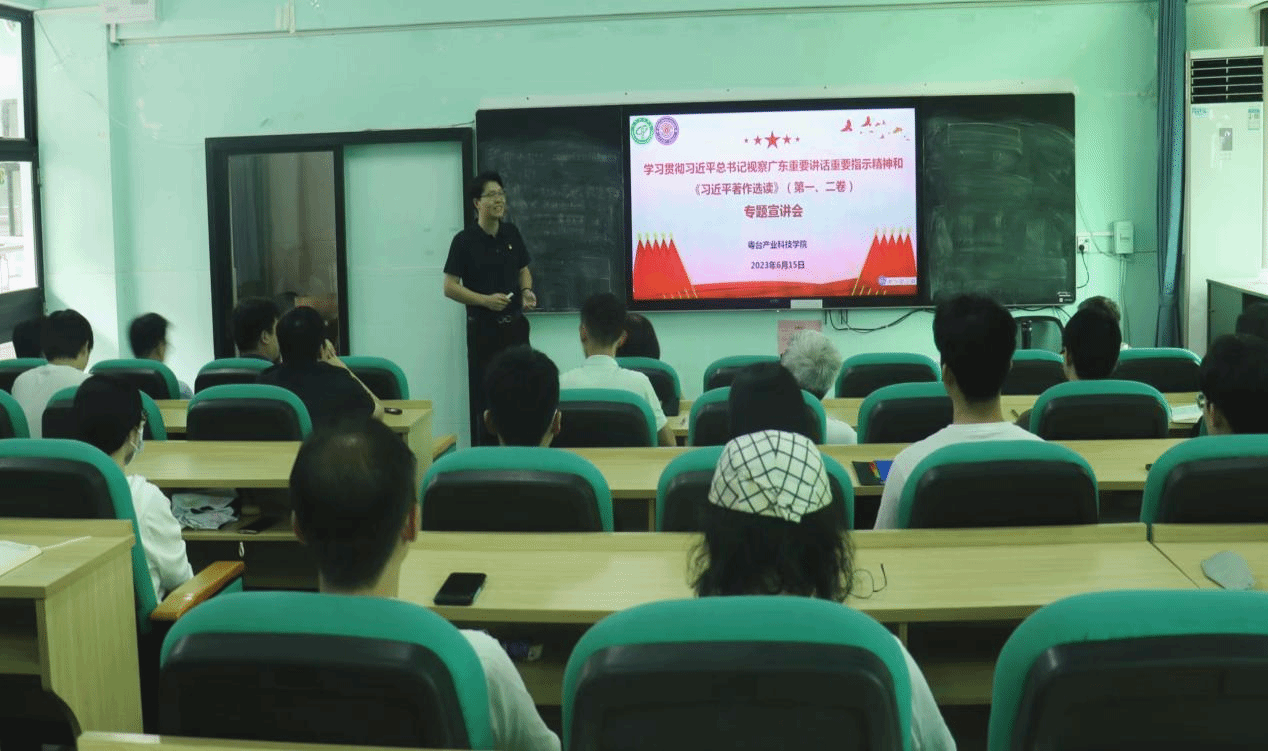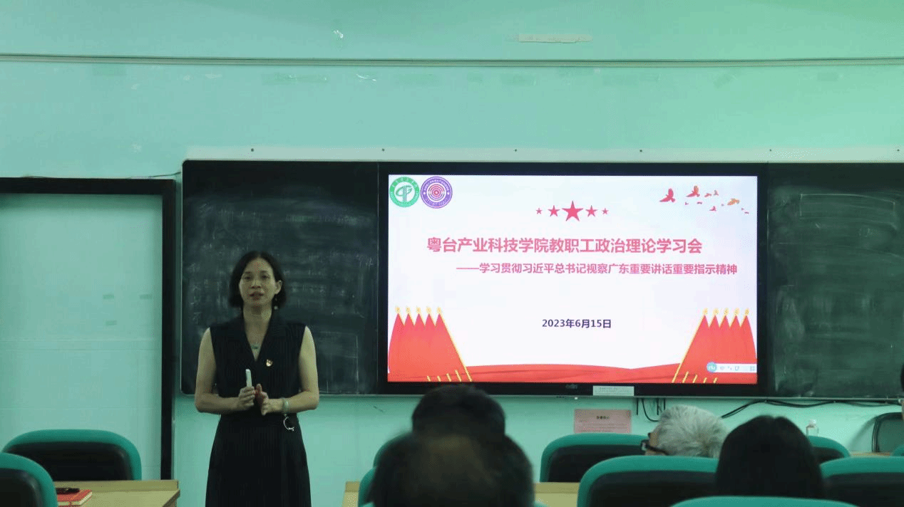 为推动学习贯彻习近平新时代中国特色社会主义思想主题教育走深走实,6月15日,粤台公司党委在莞城校区实验楼305多功能教室开展“学习贯彻习近平总书记视察广东重要讲话重要指示精神《习近平著作选读》第一卷、第二卷”专题宣讲会。公司全体教职工、师生党员、员工代表等参加了专题学习,宣讲会由公司党委书记宋美娴主持,马克思主义公司马冀群博士主讲。