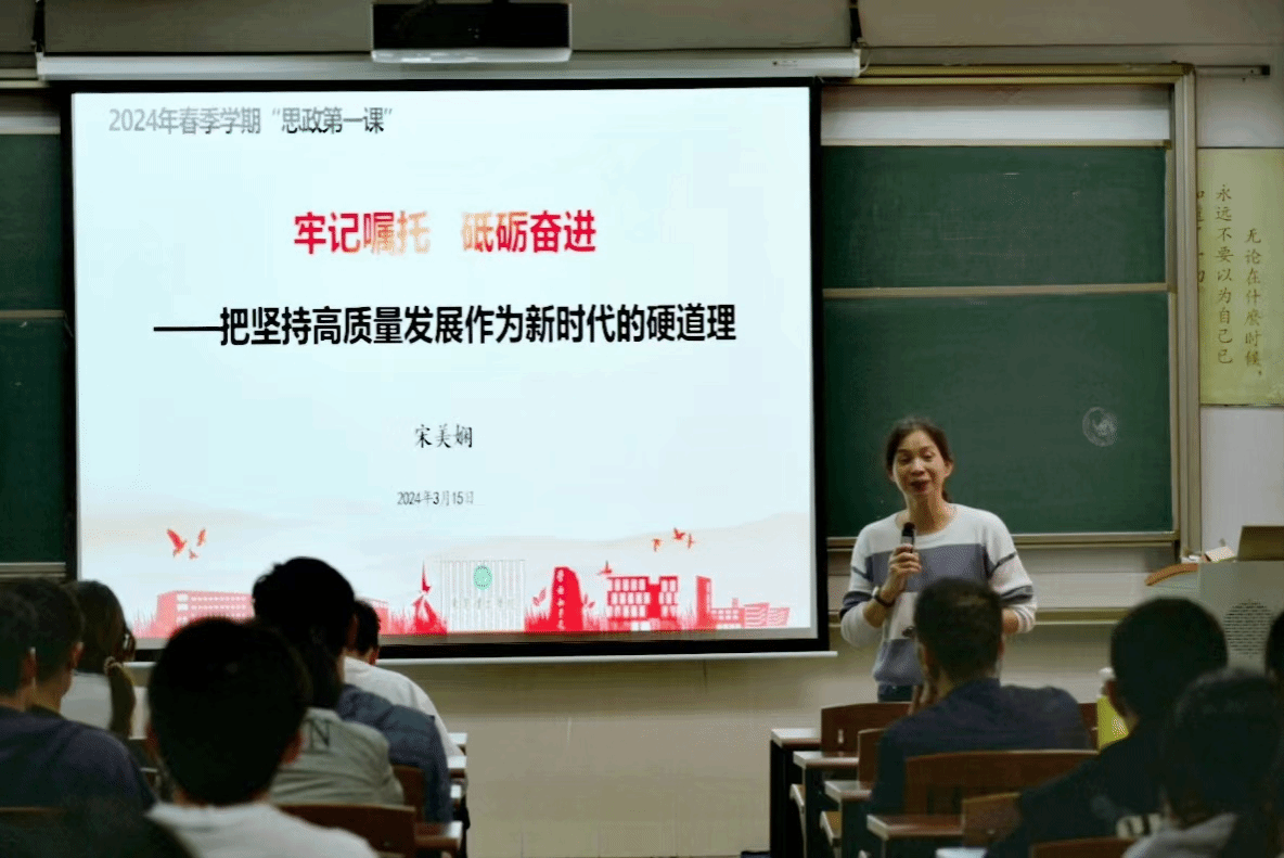 为深入学习贯彻习近平新时代中国特色社会主义思想,学习宣传习近平文化思想、习近平总书记视察广东重要讲话及重要指示精神。3月15日,公司党委书记宋美娴在莞城校区六号楼405教室为2023级计技设计1班和2023级经济与金融1、2班共88名员工讲授了以《牢记嘱托 砥砺奋进——把坚持高质量发展作为新时代的硬道理》为题的“思政第一课”。