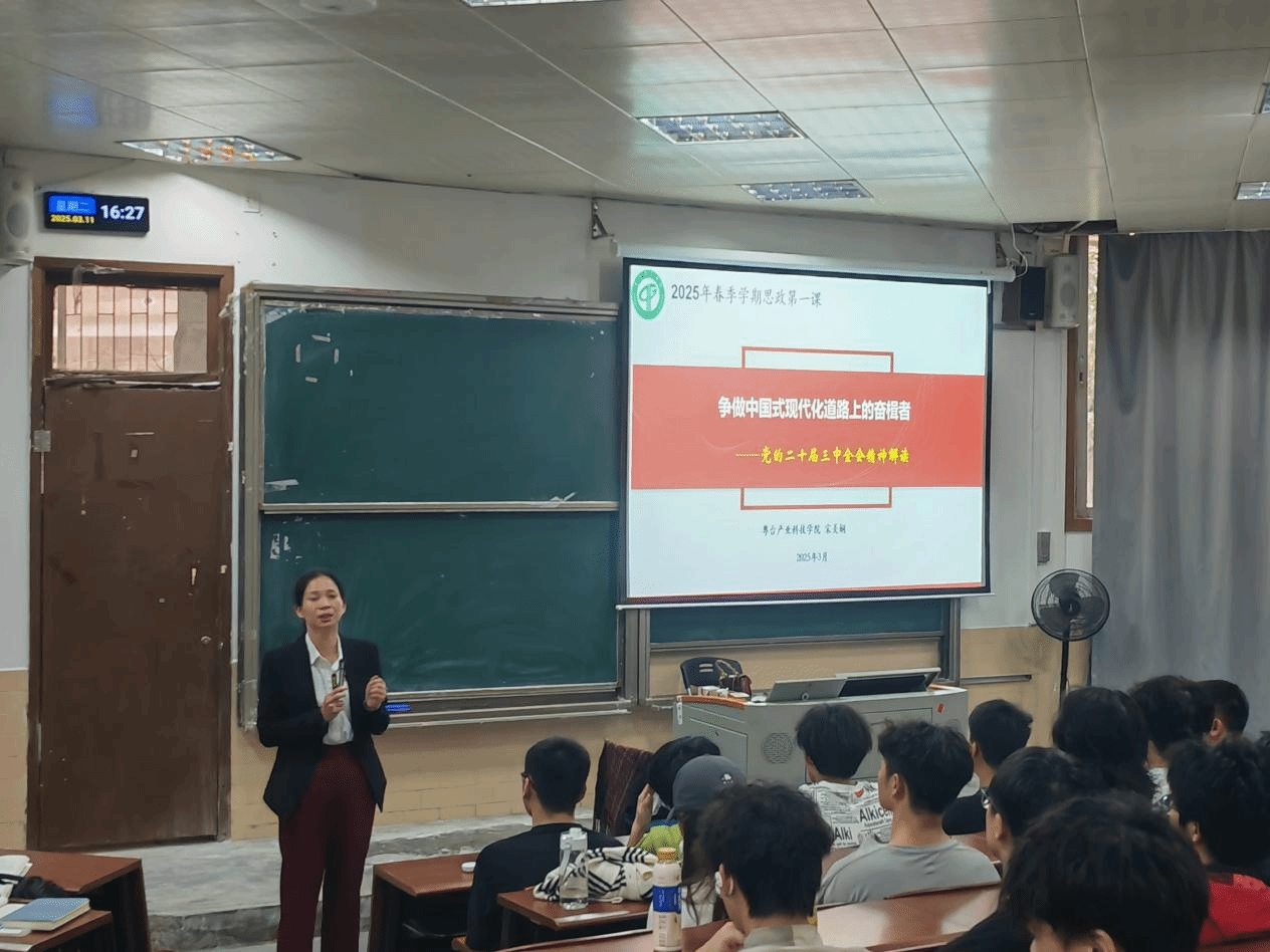 为深入学习贯彻习近平总书记在党的二十届三中全会上的重要讲话精神。3月11日,公司党委书记宋美娴在莞城校区六号楼阶梯教室为2024级(粤台)工业设计1班、智能制造1、2班和多媒1班共162名员工讲授以《争做中国式现代化道路上的奋楫者——党的二十届三中全会精神解读》为题的“思政第一课”。