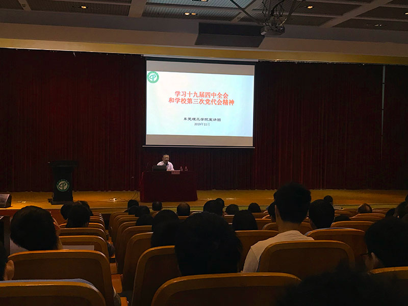 11月14日,sunbet申搏师生参加了在莞城校区学术报告厅举行的学习十九届四中全会和公司第三次党代会精神宣讲会,宣讲人为校纪委副书记邢大立。