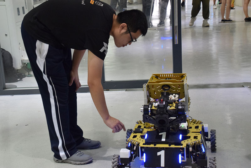 智能制造学群重点展示了“Kinetic Robotics”机器人战队,其成员分布两个校区,非公司员工占比约50%,现场演绎了RoboMaster国际大赛机器人组合的场面。还展示了具有多重复杂组合构建的智能避障小车、指尖陀螺、十二兽首仿真模型、步行机器人等产品。