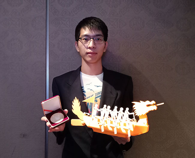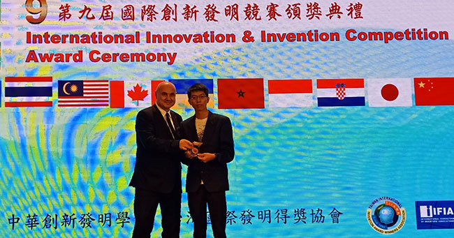 2018第九届IIIC国际创新发明竞赛是由台湾的“中华创新发明协会”与俄罗斯阿基米得国际发明协会共同主办,参赛专利(作品)优胜者可被评为金、银、铜奖。本次大赛共收到来自13个国家的368件参赛作品,sunbet申搏作品“拟人划桨龙舟装置”被评为金牌奖,何泽辉同学参加了11月8日于台湾台北国宾大饭店举行的颁奖典礼。指导老师廖威量拥有比较丰富的国际发明比赛经验,已累积获5金5银1铜奖,他表示参加本次比赛的作品,必须事先申请了发明专利。本次比赛达到研发团队完训、出兵、练兵的目的,为以后参加更高层次的德国纽伦堡发明展、美国匹兹堡发明展等积累了经验。