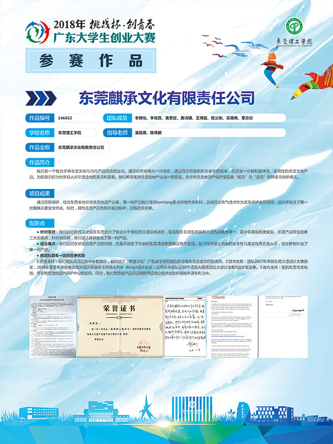 “东莞麒承文化有限责任公司”致力于将非遗文化与当代产品相结合,通过对市场痛点一些结合,透过自主研发的新型安全的技术,创造出一些具有趣味性、实用性的非遗文化产品,引起当代年轻人对非遗文化的关注和喜爱。公司希望围绕非遗文化产业这一新领域,为非物质文化遗产保护实现由“输血”向“造血”的转变寻找新模式。