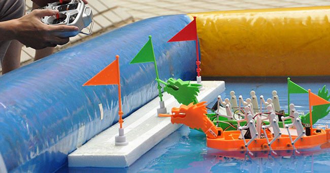 “拟人划桨龙舟装置”是一个以中国传统龙舟赛为应用情境的遥控互动机械龙舟玩具,整个龙舟装置由两个船侧的电机带动各三个假人模拟划船动作,船头用2个舵机操作龙头与龙颈,赋与龙头具有前伸与俯仰的功能,并透过伸出的叉形龙舌设计,可以达成用龙舌于竞赛终点拔旗夺标的功能;另外,船尾用一舵机控制龙尾与尾舵的连体机构,达成可摆动改变船行进方向的目的。整个龙舟5个电机的摇控控制设计成一个控制电路板,以Arduino NANO为主控IC,应用Ardublockly图形化语言撰写程序,再透过PS2摇控器进行多功能的摇控。