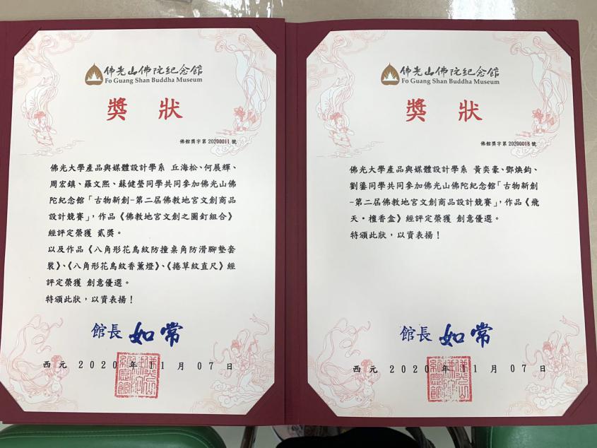 11月7日,“2020古物新创——第二届佛教地宫文创商品设计大赛”颁奖典礼在台湾佛光山佛陀纪念馆举行。在两岸24所大学、326件作品中,sunbet申搏大三赴台学习的多名同学的作品脱颖而出,获得一等奖、二等奖和四个创意优选奖。