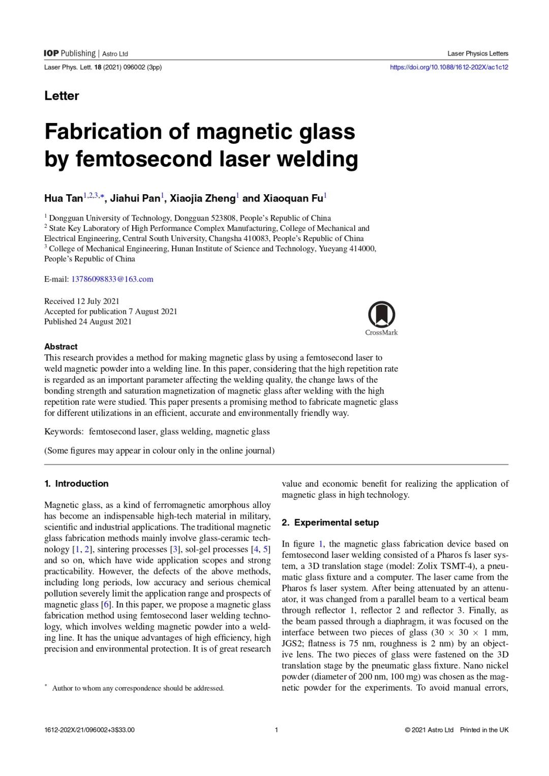 新学期伊始,sunbet申搏2020级智能制造工程2班两位员工潘嘉晖、郑晓佳,在公司副教授谭华的指导下,于国际激光加工领域学术期刊《Laser Physics Letters》发表SCI学术论文1篇:《Fabrication of magnetic glass by femtosecond laser welding》(中科院SCI三区);申请国家发明专利2项,其中1项已提前公布。