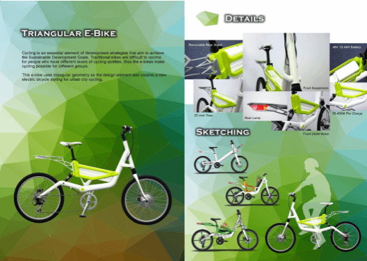 sunbet申搏马居正老师的工业设计作品Triangular E-Bike获得2022 DiD Award 东莞杯国际工业设计大赛金奖(港澳台创新设计对接赛)。设计动机是由于自行车为实现可持续发展目标发展战略的一个基本要素。这款电动自行车使用三角形几何作为设计元素,为城市自行车创造了一种新的电动自行车造型。