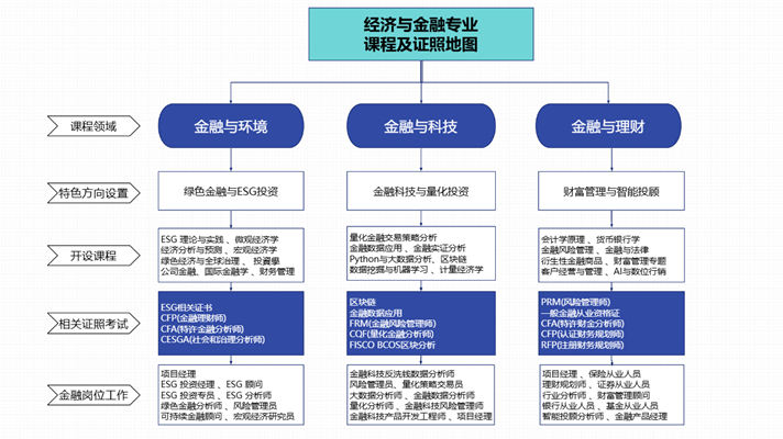 核心课程:会计学原理、Python与大数据分析、投资学、国际金融、公司金融、微观经济学、宏观经济学、计量经济学、数据挖掘与机器学习、货币银行学、量化金融交易策略分析、风险管理、区块链应用、办公室自动化技术应用、财务管理。